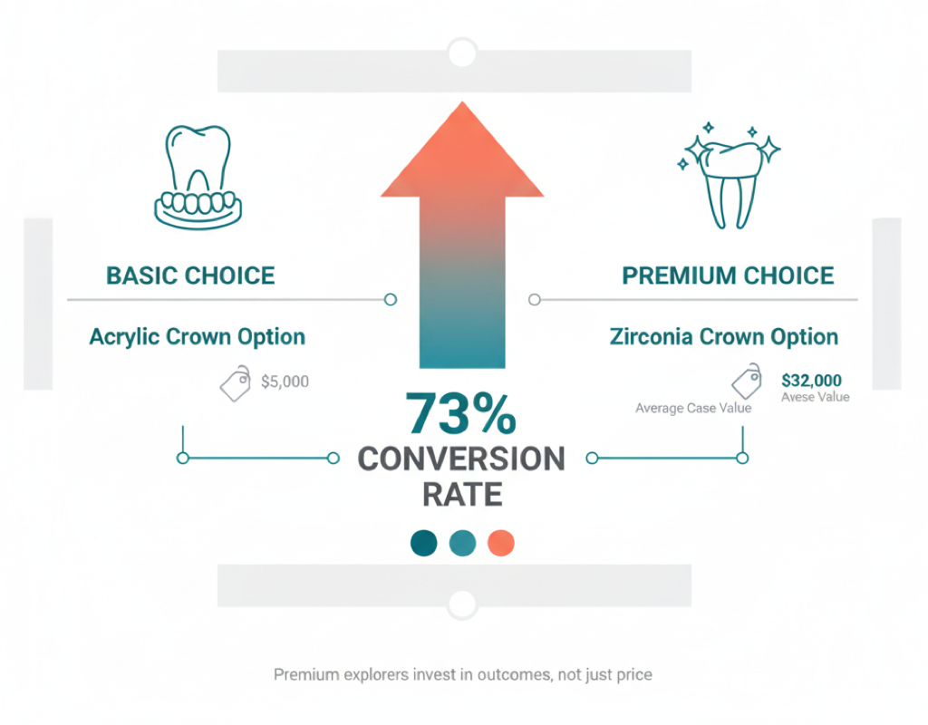 Behavior: Patient starts with basic acrylic options, then upgrades to zirconia Conversion rate: 73% Average case value: $32,000